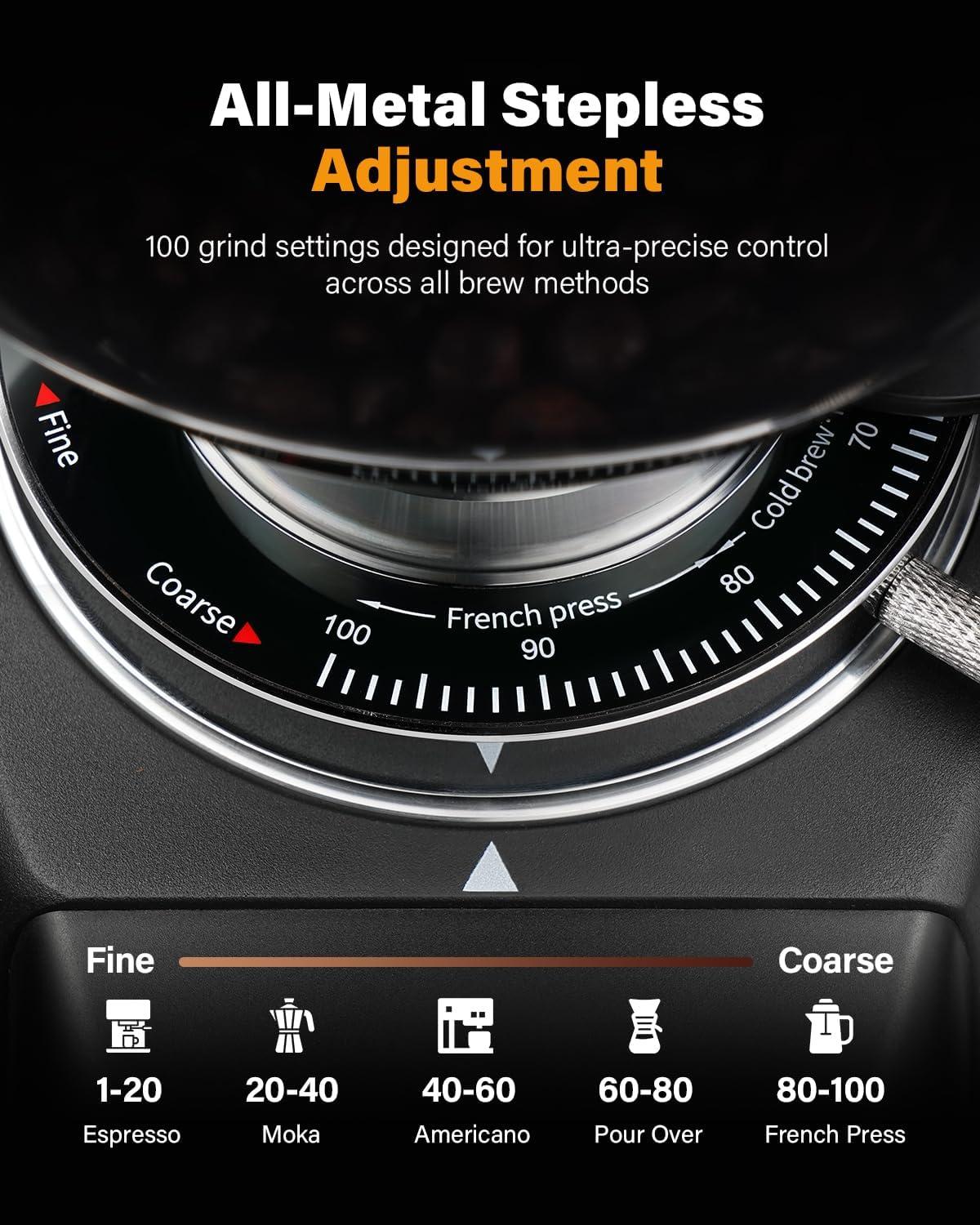 Advanced 100-Level Programmable Grind Settings: Experience unparalleled grind customization with finely graduated 100-step settings. Effortlessly dial in the perfect grind size for any brewing method, from espresso to pour-over to French press.